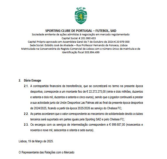 埃蘇戈轉(zhuǎn)會費為22272275.00歐元(約2227萬歐),將在本賽季結(jié)束時支付。球員將繼續(xù)為拉斯帕爾馬斯效力至2024/2025賽季結(jié)束,并從2025/2026賽季開始為切爾西效力。