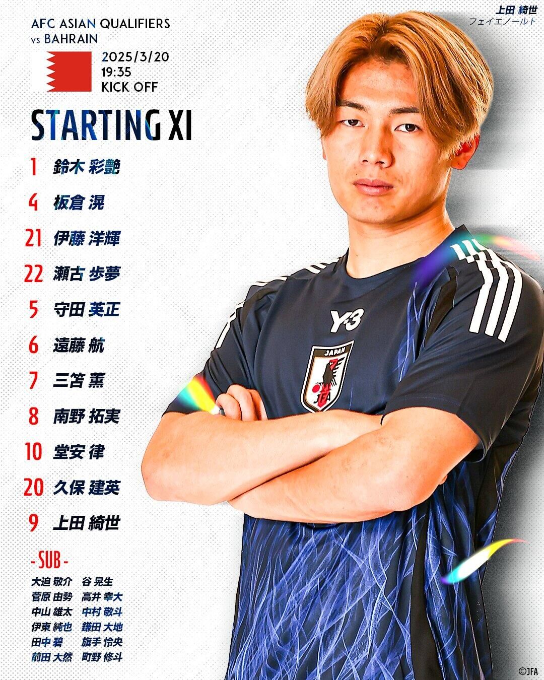 03月20日訊 北京時間18點(diǎn)35分,世預(yù)賽亞洲區(qū)第三階段C組第7輪,日本vs巴林,賽前雙方首發(fā)公布!本場比賽日本隊贏球即可提前晉級2026世界杯。
