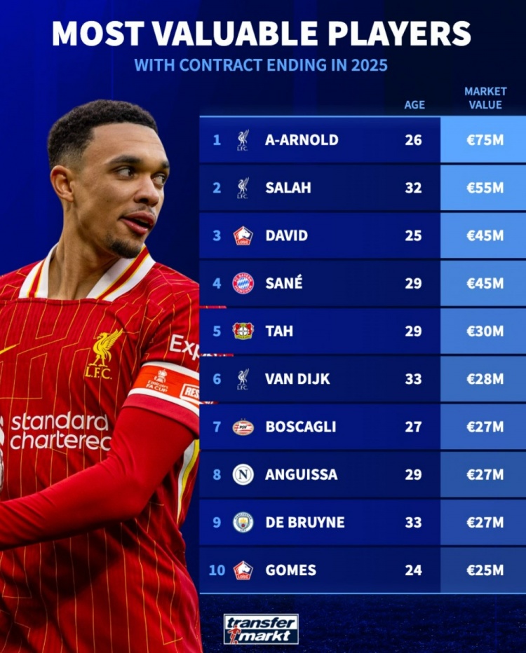3月20日訊 德轉(zhuǎn)盤點(diǎn)了目前合同將在今年到期的球員中身價(jià)最高榜單,其中阿諾德最高,利物浦三人都在前十,具體如下: