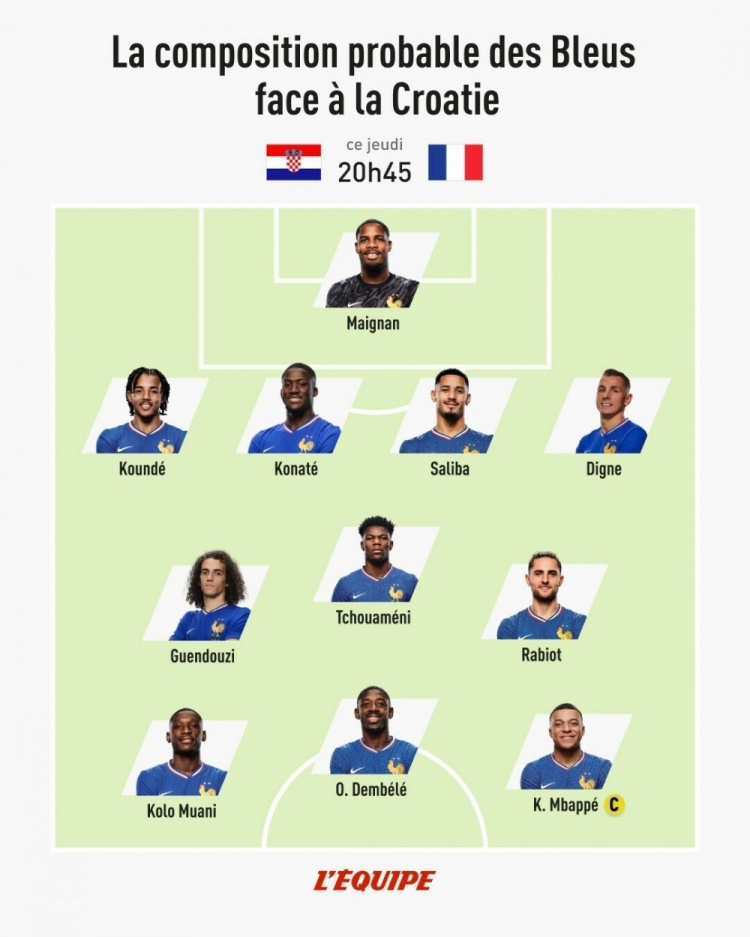 3月20日訊 北京時間明天凌晨3點45分,法國將在歐國聯(lián)1/4決賽首回合比賽中客場對陣克羅地亞?!蛾爤蟆奉A測了法國隊本場比賽的首發(fā)陣容,姆巴佩、登貝萊、穆阿尼三箭齊發(fā)。