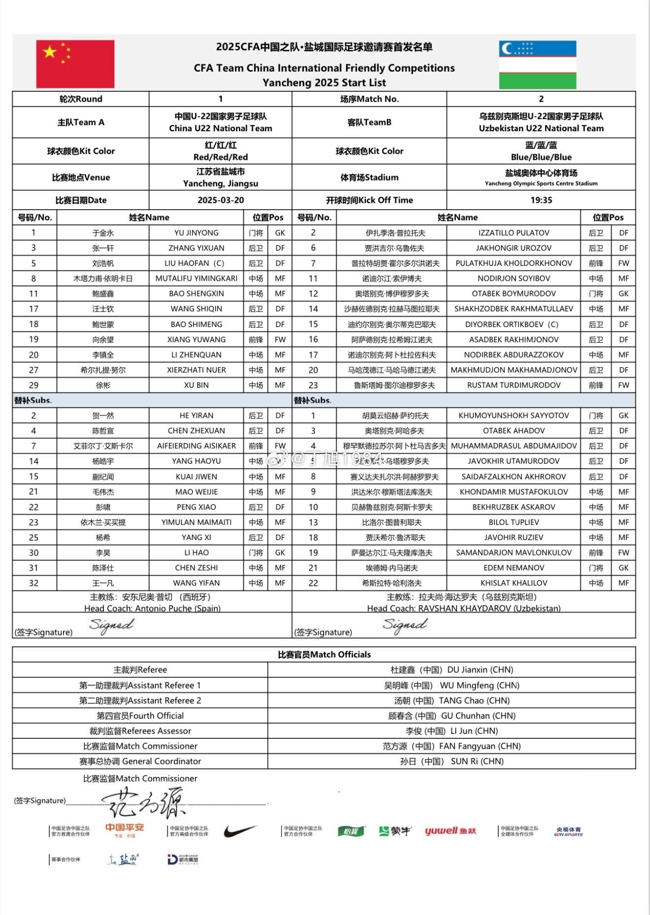 03月20日訊 2025CFA中國之隊(duì)·鹽城國際足球邀請賽,中國男足U22vs烏茲別克斯坦U22,賽前雙方首發(fā)公布!此前從國家隊(duì)集訓(xùn)回歸的徐彬、汪士欽、劉浩帆先發(fā)出戰(zhàn)。