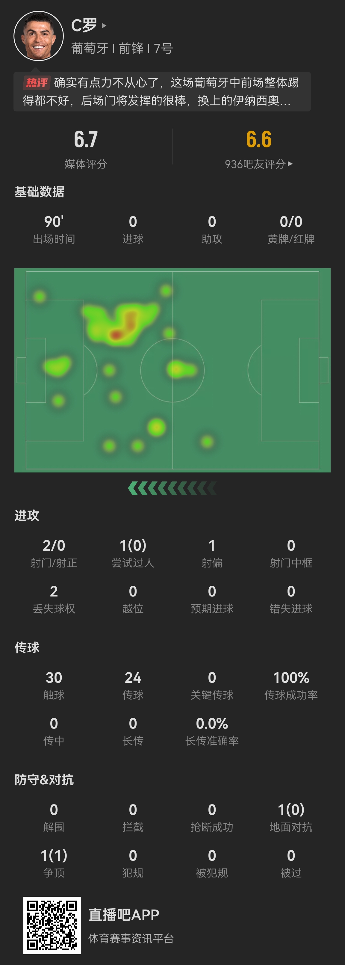40歲的C羅首發(fā)出場,打滿了全場,觸球30次,獲評6.7分,這兩項數(shù)據(jù)均為葡萄牙首發(fā)球員最低。
