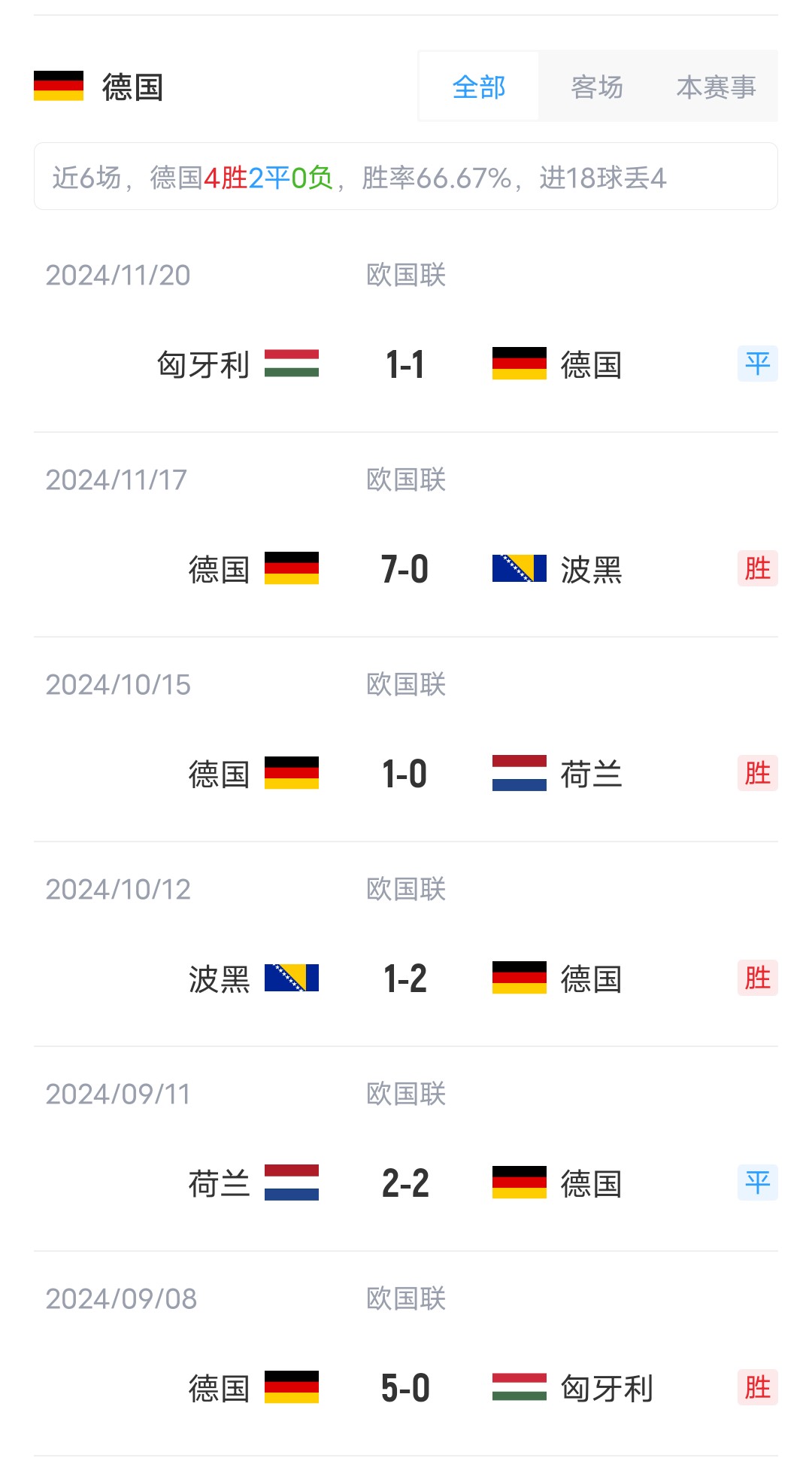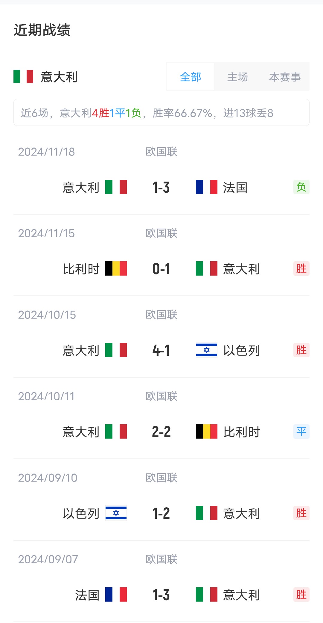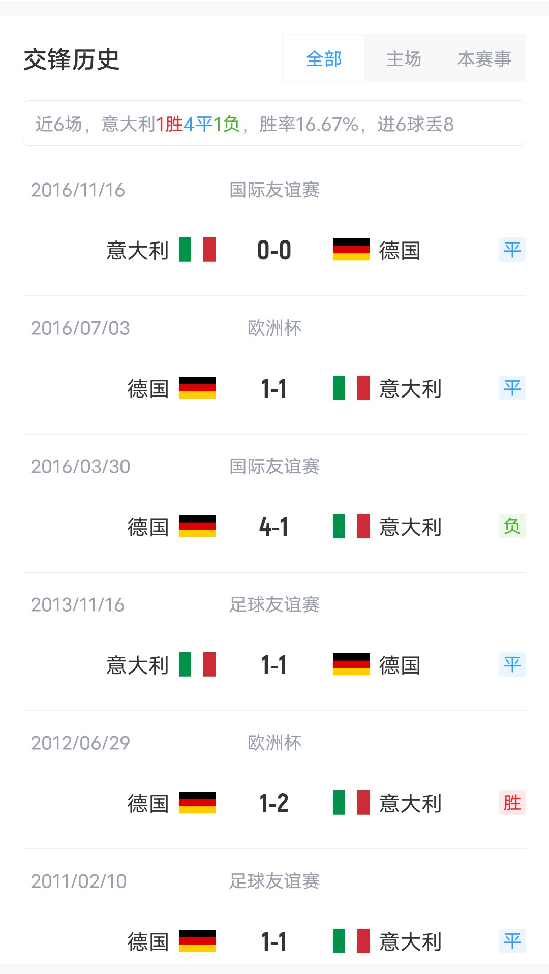 在歐國(guó)聯(lián)小組賽中,意大利排名B組第2,德國(guó)排名C組第1;雙方近6場(chǎng)直接對(duì)話中,意大利取得了1勝4平1負(fù)的戰(zhàn)績(jī)。兩隊(duì)最近一次交手,是在2016年11月16日,友誼賽意大利0-0戰(zhàn)平德國(guó)。