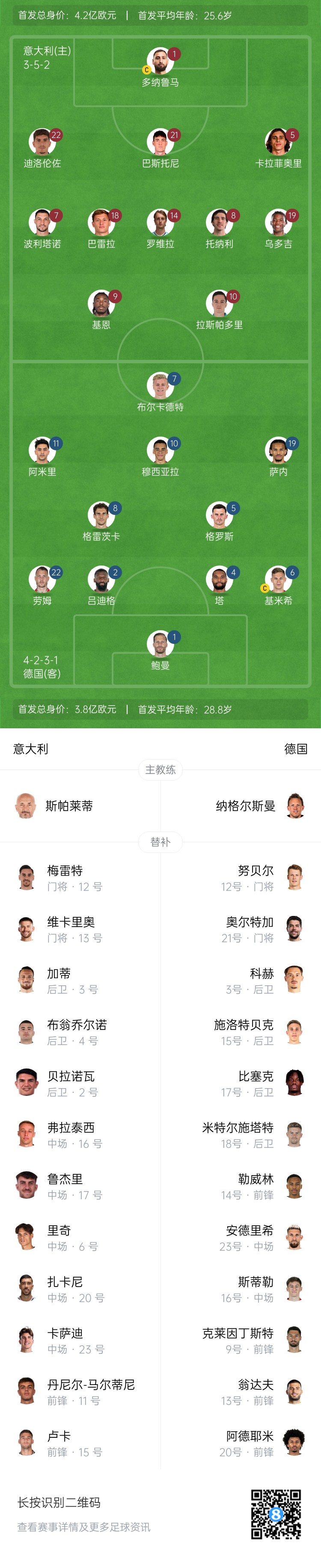 意大利首發(fā):1-多納魯馬、22-迪洛倫佐、21-巴斯托尼、5-卡拉菲奧里、7-波利塔諾、18-巴雷拉、14-羅維拉、19-烏多吉、8-托納利、9-基恩、10-拉斯帕多里
