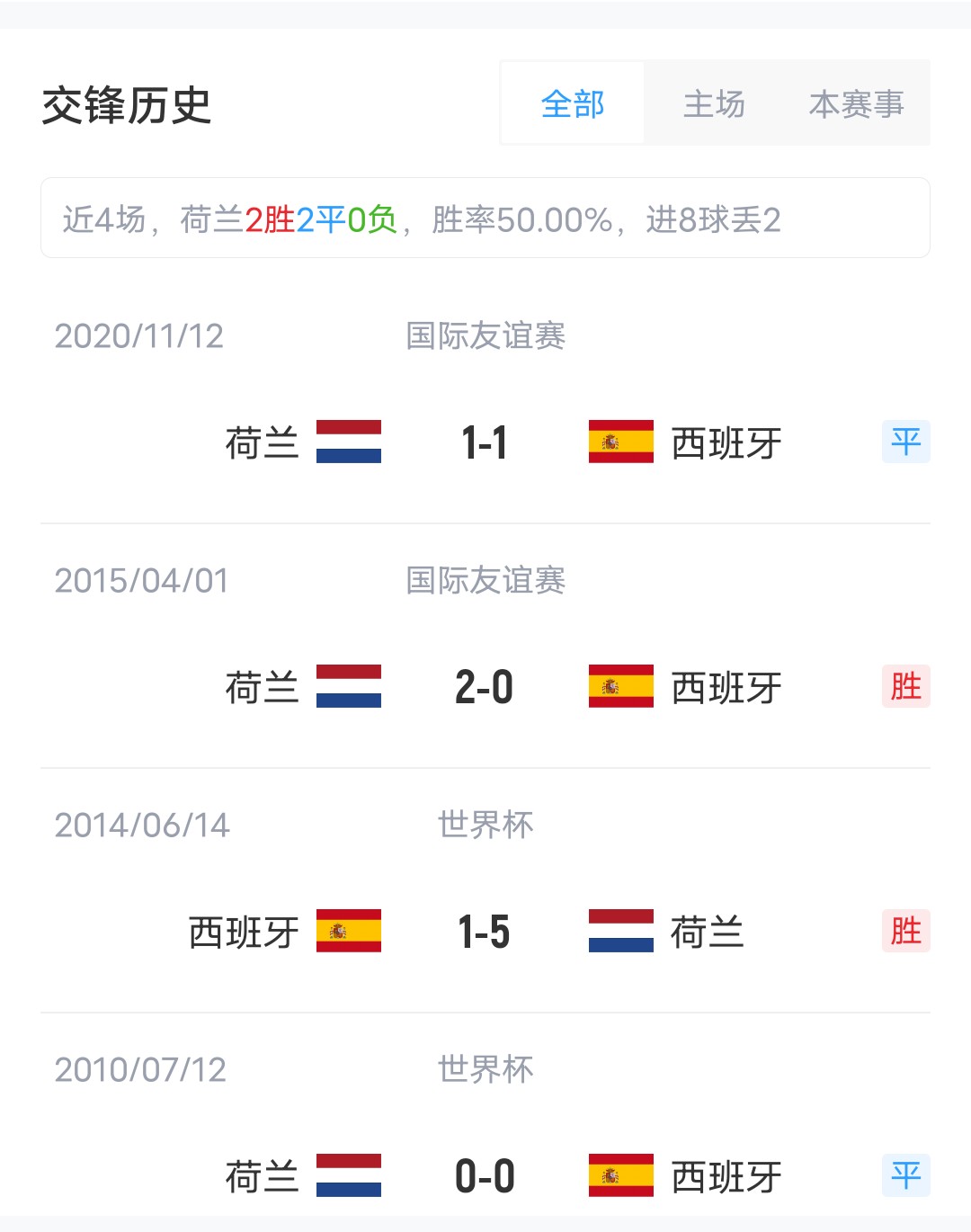 雙方近4場(chǎng)交鋒,荷蘭取得2勝2平的戰(zhàn)績(jī)稍居上風(fēng)。