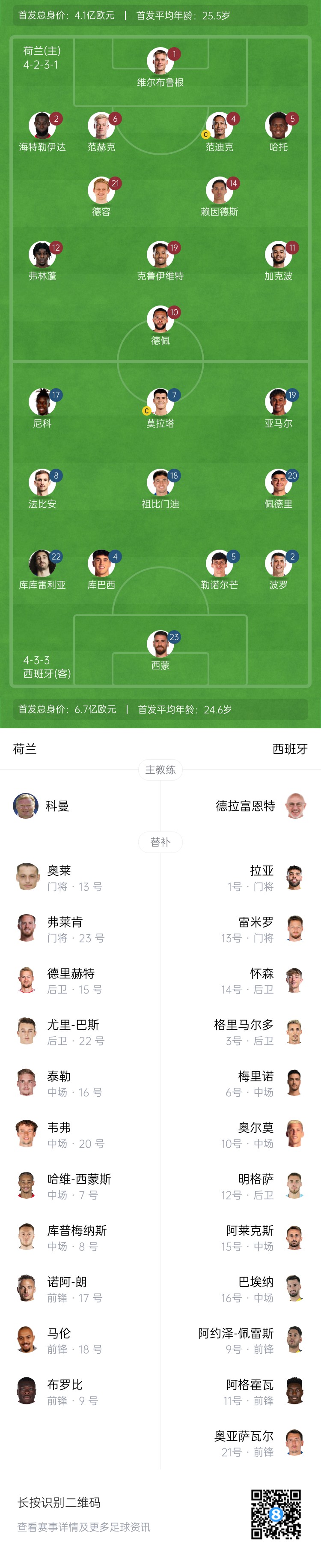 荷蘭替補(bǔ):13-奧萊、23-弗萊肯、7-哈維-西蒙斯、8-庫(kù)普梅納斯、9-布羅比、15-德里赫特、16-泰勒、17-諾阿-朗、18-馬倫、20-韋弗、22-巴斯