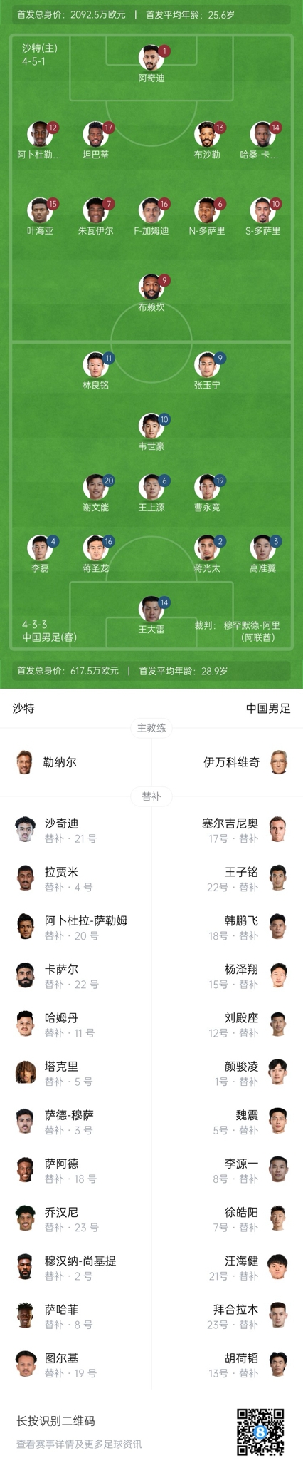 沙特替補:21-哈米德-尚基提、22-艾哈邁德-卡薩爾、2-穆漢納-尚基提、3-薩阿德-穆薩、4-阿里-拉賈米、5-吉哈德-薩克里、23-齊亞德-喬漢尼、8-馬爾萬-薩哈菲、11-阿卜杜拉-哈姆丹、18-穆哈納德-薩阿德、19-圖爾基-阿馬爾、20-阿卜杜拉-薩利姆