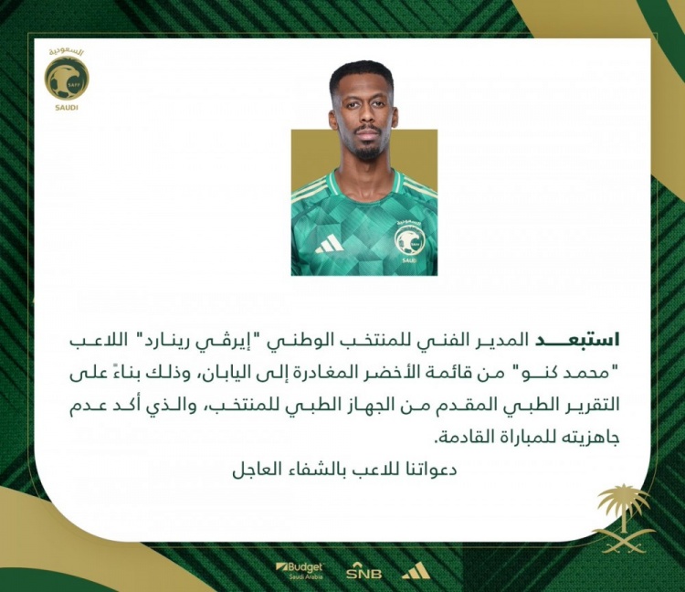 沙特國家隊發(fā)布公告,確認(rèn)30歲中場卡努因傷退出本期名單,此前沙特1-0擊敗國足的比賽,卡努就沒有進入比賽名單。