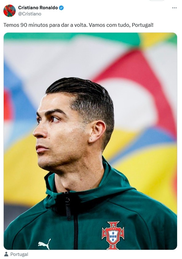 C羅曬出了自己的照片,并配文寫(xiě)道:“我們有90分鐘的時(shí)間扭轉(zhuǎn)局面,讓我們?nèi)σ愿?,葡萄牙!?/span>
