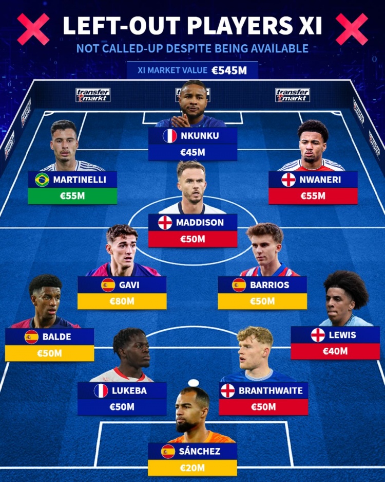 落選國家隊(duì)陣容(總價(jià)5.45億歐,不包含傷缺球員):