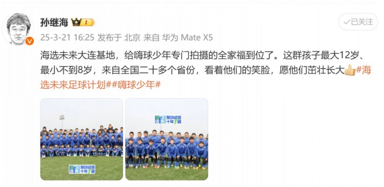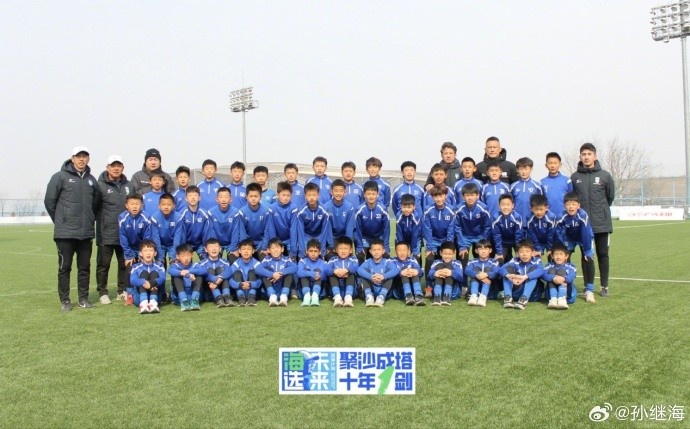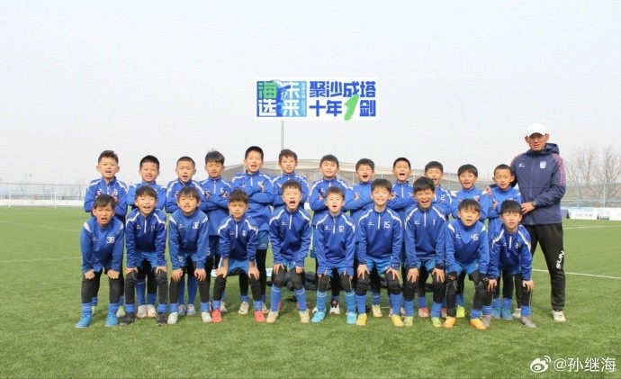 孫繼海寫道:海選未來大連基地,給嗨球少年專門拍攝的全家福到位了。這群孩子最大12歲、最小不到8歲,來自全國二十多個省份,看著他們的笑臉,愿他們茁壯長大。