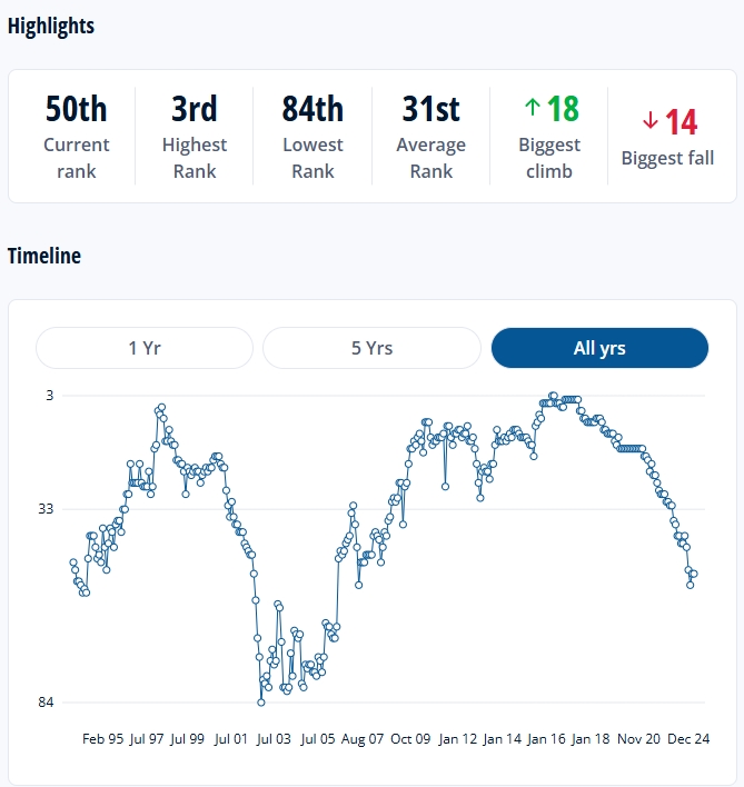 智利的FIFA排名曾在2016年達(dá)到隊(duì)史最高的第3名,從2021年開(kāi)始,智利的排名就不斷下降,最低跌至過(guò)第53名,如今為第50名。