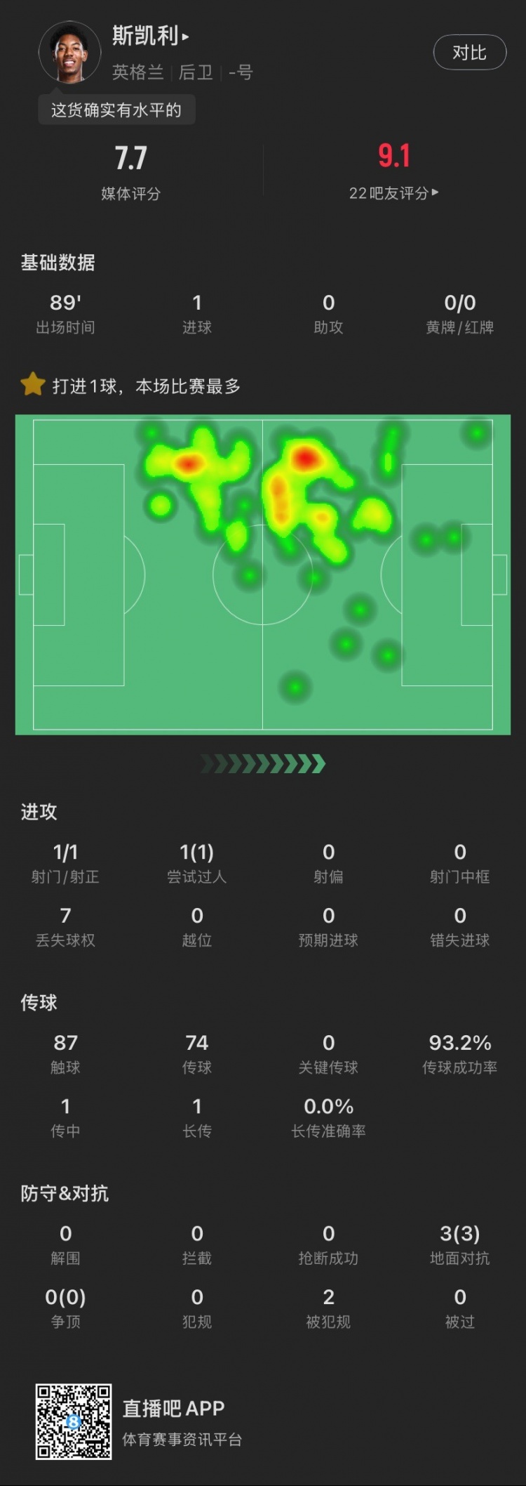 18歲斯凱利本場:首秀破門!3次對(duì)抗全部成功,1過人,獲評(píng)7.7分