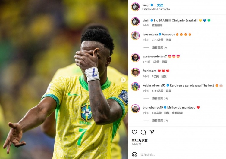 維尼修斯也在賽后通過社媒曬出自己的慶祝照,并配文:“這就是巴西?。。「兄x巴西利亞?。?!”