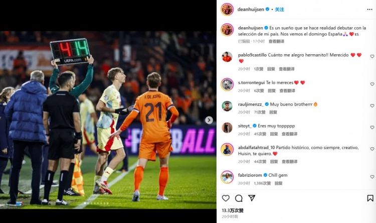 他也在賽后通過社媒曬出自己的替補登場照,并配文:“為國家隊完成首秀就是夢想成真。我們周日再見,西班牙!”