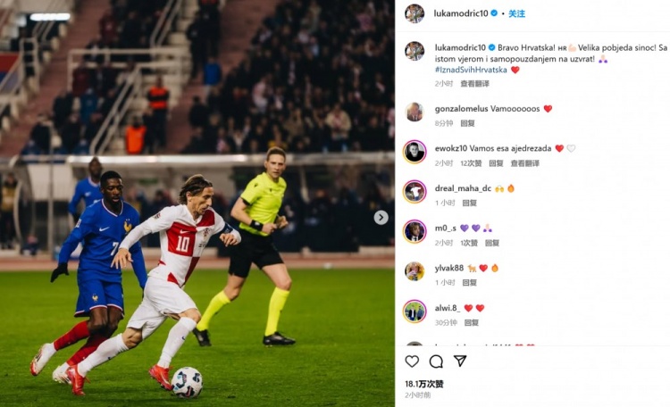 3月22日訊 克羅地亞在歐國聯(lián)八強戰(zhàn)首回合主場2-0擊敗法國,隊長莫德里奇在賽后通過社媒慶祝勝利。