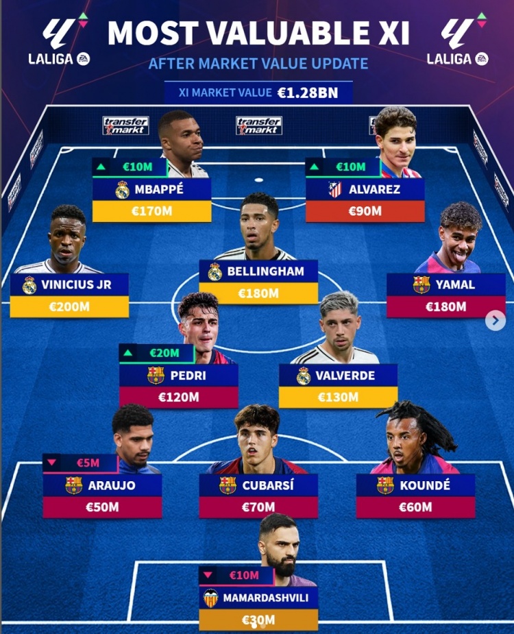 德轉(zhuǎn)列西甲身價(jià)最貴陣:巴薩5人、皇馬4將,小蜘蛛、瑪瑪達(dá)在列