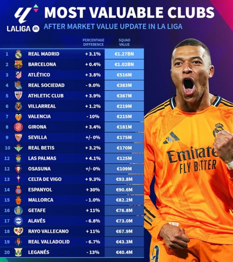 德轉更新西甲球隊身價榜:皇馬12.7億、巴薩10.2億、馬競5.16億
