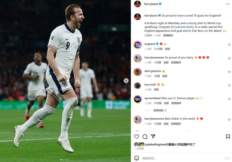 凱恩社媒曬照:自豪打進(jìn)在英格蘭的第70球,祝賀斯凱利首秀破門