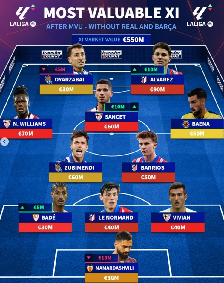 3月22日訊 德轉更新了西甲球員身價,并盤點了除皇馬、巴薩球員之外的西甲最貴陣容,其中阿爾瓦雷斯領銜馬競3人在列,具體如下: