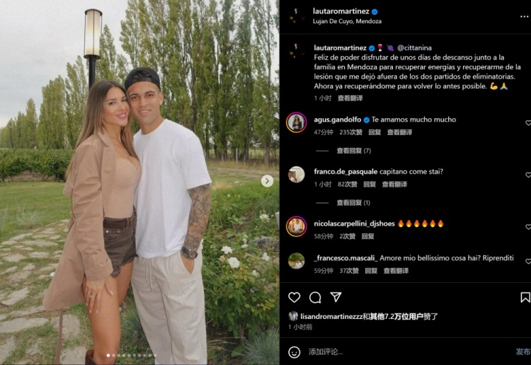 勞塔羅曬出和家人度假的照片,并寫道:我很開心能夠和家人在門多薩休息幾天,從而補(bǔ)充能量。我因傷缺席了兩場(chǎng)世界杯預(yù)選賽,希望能從傷病中恢復(fù)過來。 現(xiàn)在我正在康復(fù)當(dāng)中,以便盡快復(fù)出。