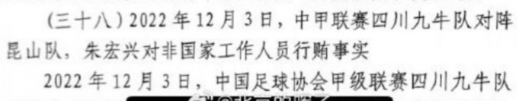 2022年12月3日,中甲聯(lián)賽四川九牛隊對陣?yán)ド疥牐旌昱d對非國家工作人員行賄事實。