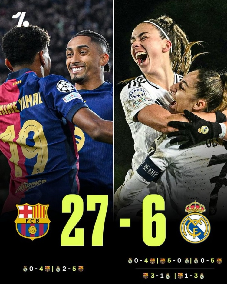 巴薩男女足本賽季對皇馬只輸了一場,7戰(zhàn)6勝1負共打進27球丟6球