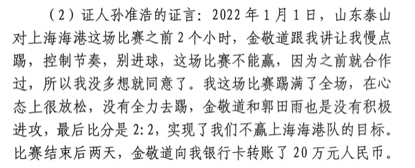 其中孫準(zhǔn)浩的證言為:“2022年1月1日,山東泰山對上海海港這場比賽之前2個小時,金敬道跟我講讓我慢點踢,控制節(jié)奏,別進球,這場比賽不能贏,因為之前就合作過,所以我沒多想就同意了。我這場比賽踢滿了全場,在心態(tài)上很放松,沒有全力去踢,金敬道和郭田雨也是沒有積極進攻,最后比分是2:2,實現(xiàn)了我們不贏上海海港隊的目標(biāo)。 比賽結(jié)束后兩天,金敬道向我銀行卡轉(zhuǎn)賬了20萬元人民幣。”