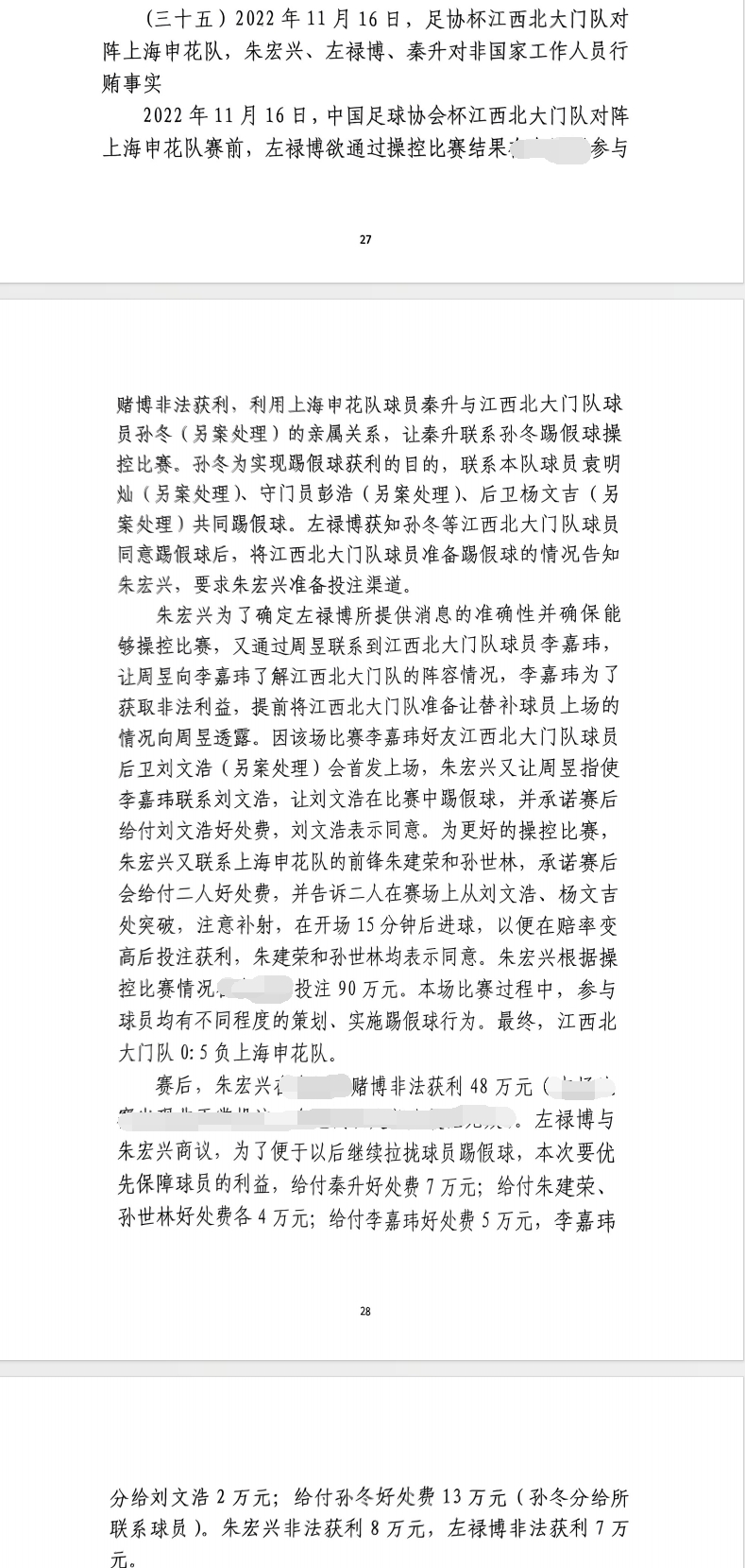 2022年11月16日,足協(xié)杯江西北大門隊(duì)對(duì)陣上海申花隊(duì)、朱宏興、左祿博、秦升對(duì)非國(guó)家工作人員行賄事實(shí)