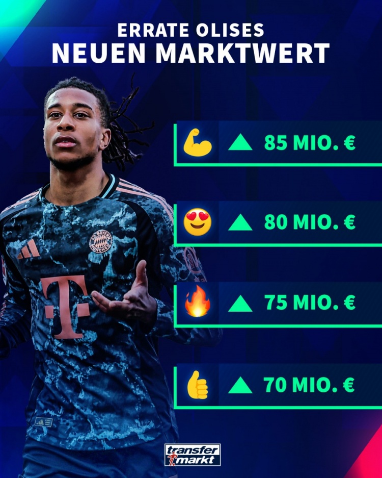 奧利塞目前的德轉(zhuǎn)身價為6500萬歐元,對于他接下來的最新身價,德轉(zhuǎn)給出了4個選項,由低到高為7000萬歐、7500萬歐、8000萬歐、8500萬歐。