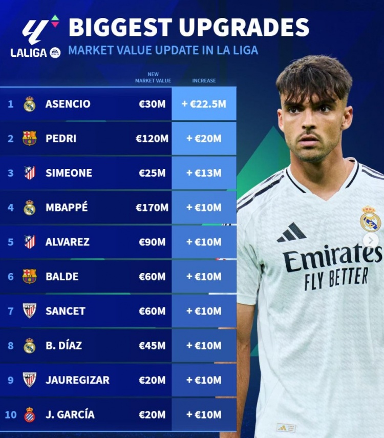 西甲身價(jià)升值榜:勞爾-阿森西奧、佩德里領(lǐng)銜 姆巴佩、小蜘蛛在列