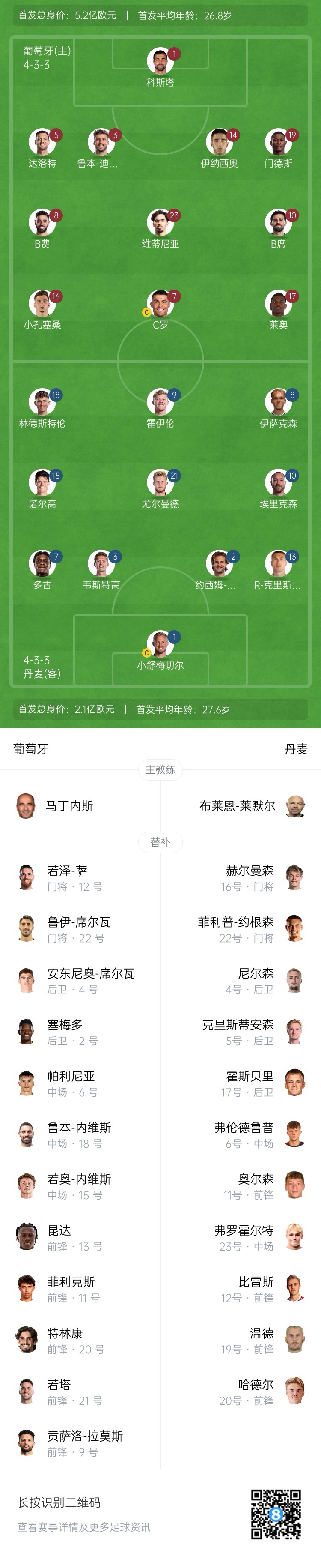 3月24日訊 歐國聯(lián)1/4賽決賽次回合,葡萄牙對陣丹麥,賽前首發(fā)公布。