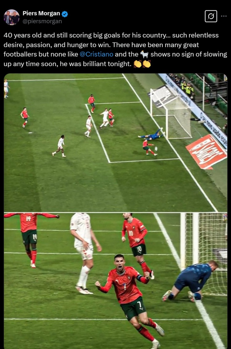 摩根寫道:40歲了,依然能為國(guó)家隊(duì)取得關(guān)鍵進(jìn)球……他彰顯了如此不懈的渴望、激情和對(duì)勝利的饑餓感。偉大的球員有很多,但沒有一個(gè)能像C羅一樣。并且,GOAT(歷史最佳球員)沒有任何跡象表明他會(huì)很快放慢腳步,他今晚表現(xiàn)得非常出色。????
