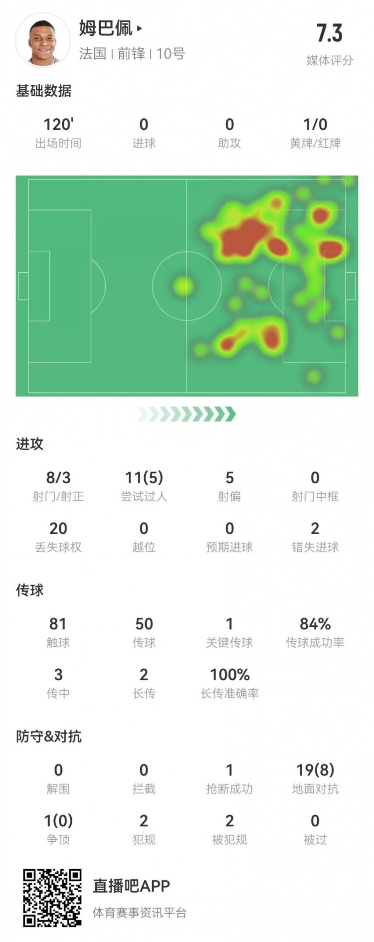 姆巴佩本場8射3正+2失良機+點射命中 20對抗8成功+20丟失球權