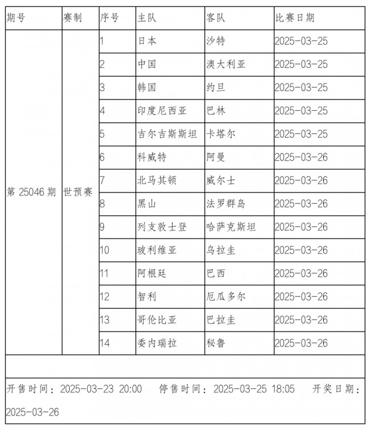 傳足勝負(fù)彩第25046期競猜賽事為亞洲區(qū)、歐洲區(qū)和南美區(qū)的世界杯預(yù)選賽。本期,亞洲區(qū)中國、日本和韓國東亞三強(qiáng)將分別在主場對陣澳大利亞、沙特和約旦,南美區(qū)則迎來阿根廷VS巴西的重頭戲。