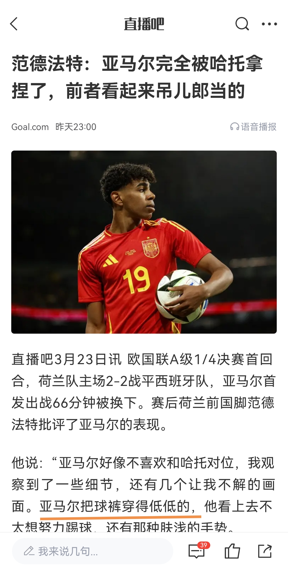 亞馬爾的這一動作顯然是有意為之。就在這場比賽前,荷蘭名宿范德法特批評了亞馬爾在首回合的表現(xiàn),甚至認(rèn)為亞馬爾“亞馬爾把球褲穿得低低的,他看上去不太想努力踢球,還有那種膚淺的手勢”。