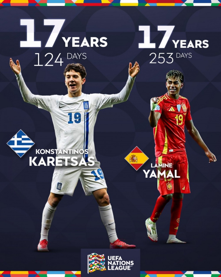 歐足聯(lián)也發(fā)推稱贊了這兩名小將,表示目前歐國聯(lián)最年輕的進(jìn)球球員是17歲124天的希臘小將卡雷查斯,17歲253天的亞馬爾排在第二。