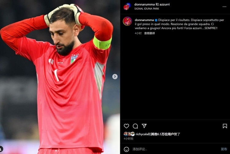 3月24日訊 歐國聯(lián)1/4決賽次回合,意大利3-3戰(zhàn)平德國,總比分4-5被淘汰。賽后,多納魯馬更新了社媒,就結(jié)果道歉,并鼓舞了士氣。