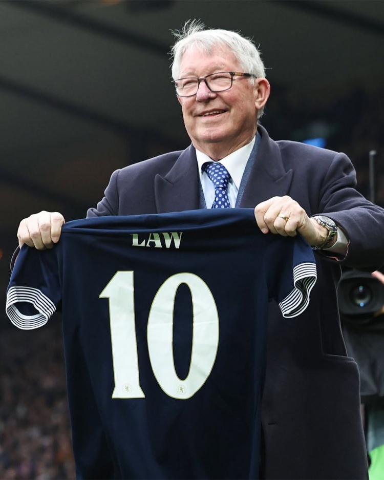 3月24日訊 當(dāng)?shù)貢r(shí)間上周末蘇格蘭對(duì)陣希臘的歐國聯(lián)賽前,弗格森手持丹尼斯-勞蘇格蘭隊(duì)10號(hào)球衣,向其致以敬意。