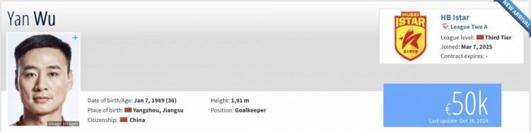 在德轉吳龑的個人頁面上顯示,他已經(jīng)于3月7日加盟了中乙球隊湖北青年星。