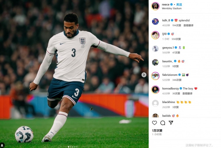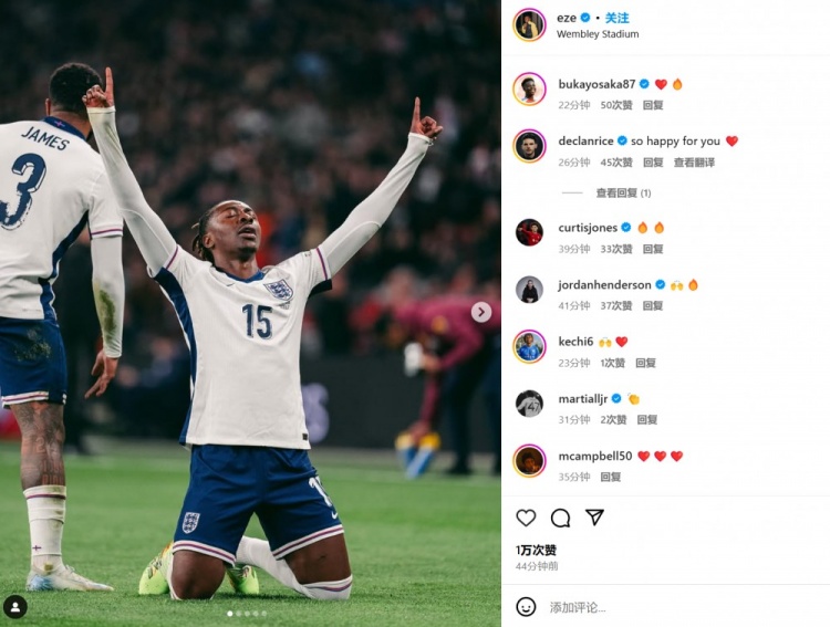 同場(chǎng)打進(jìn)英格蘭隊(duì)處子球!里斯-詹姆斯&埃澤社媒曬照紀(jì)念