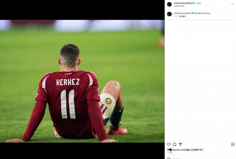 匈牙利本次國(guó)際比賽日兩戰(zhàn)皆墨,兩回合1-6輸給了土耳其,科爾克茲曬出自己的照片,并寫(xiě)道:“我們會(huì)回來(lái)的!”