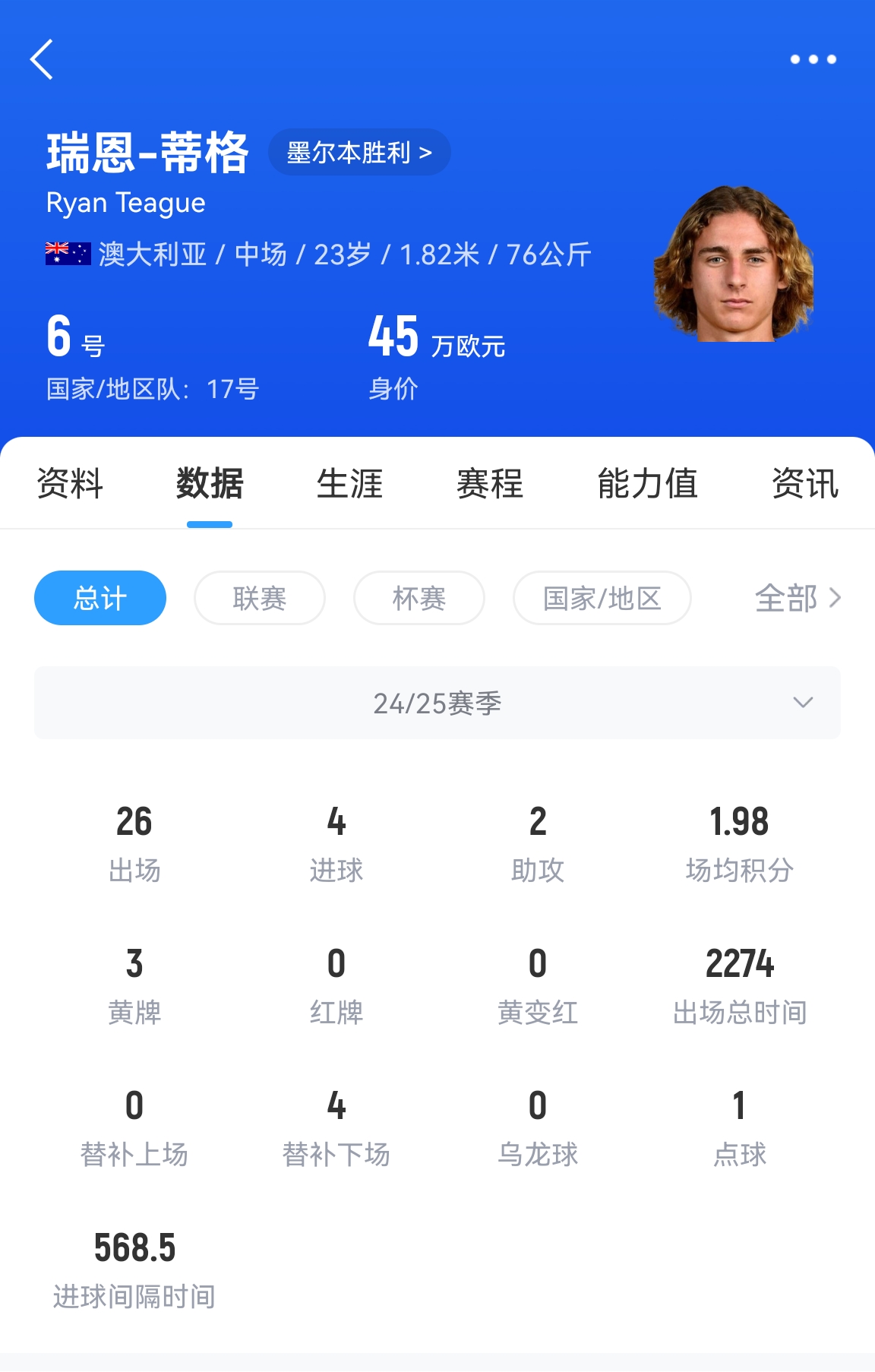 蒂格本賽季為墨爾本勝利出場(chǎng)26次打入4球2助攻,他的德轉(zhuǎn)身價(jià)為45萬(wàn)歐元。