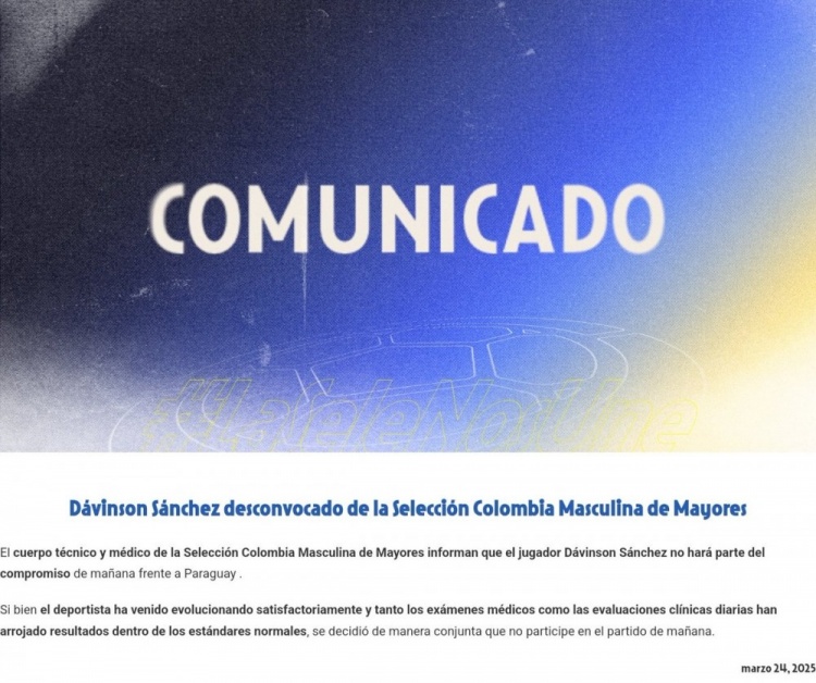哥倫比亞隊發(fā)布官方公告,確認達文森-桑切斯的健康狀況正在好轉(zhuǎn),體檢結(jié)果也在正常范圍內(nèi),但經(jīng)球隊與球員一致決定,他將不會參加對陣巴拉圭的世預賽。