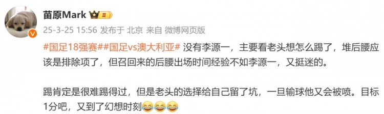3月25日訊 國足今晚將在世預賽杭州主場對陣澳大利亞,媒體人苗原發(fā)文談到對國足陣容的看法。