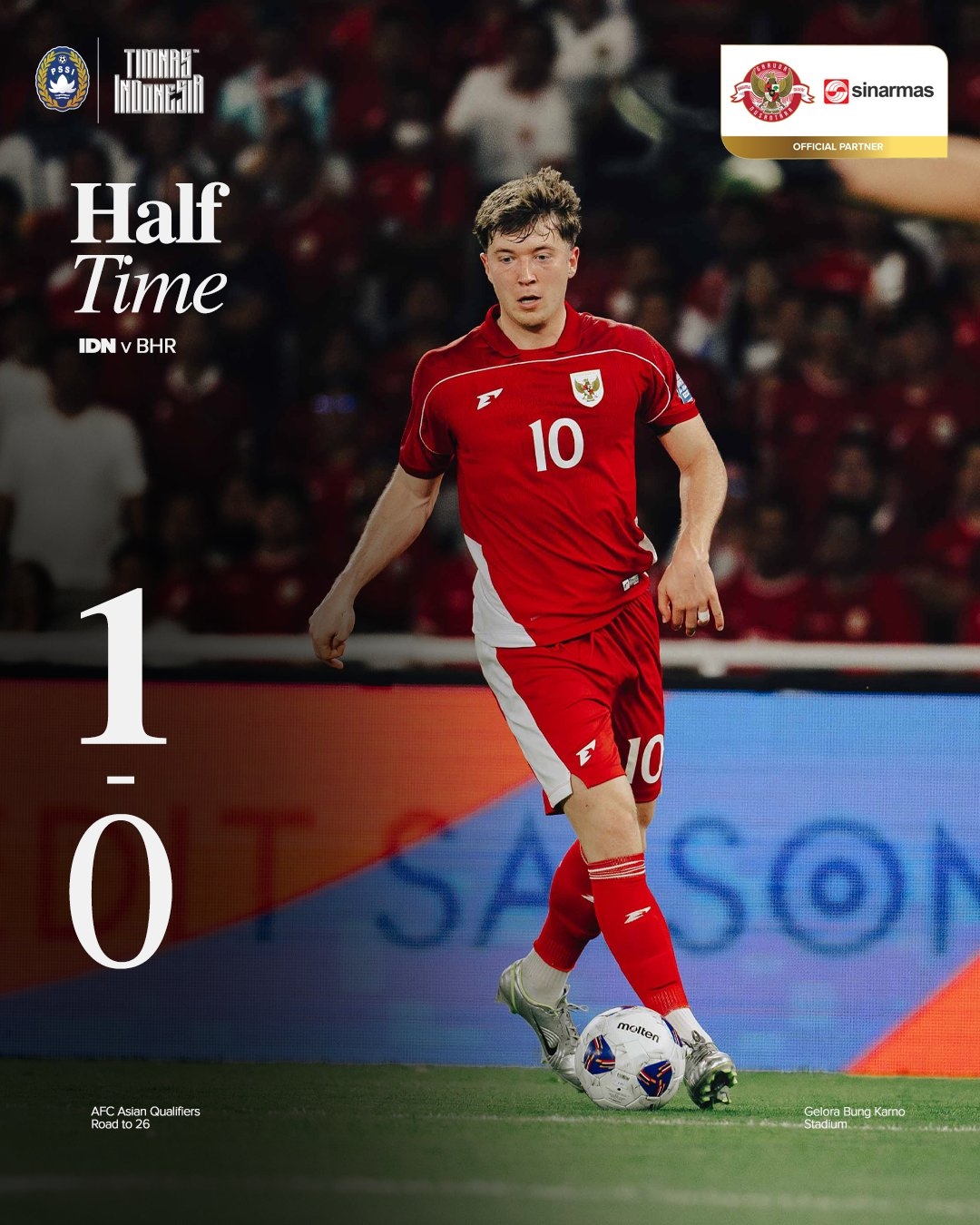 傷停補(bǔ)時(shí)1分鐘。上半場比賽結(jié)束,印尼1-0巴林。