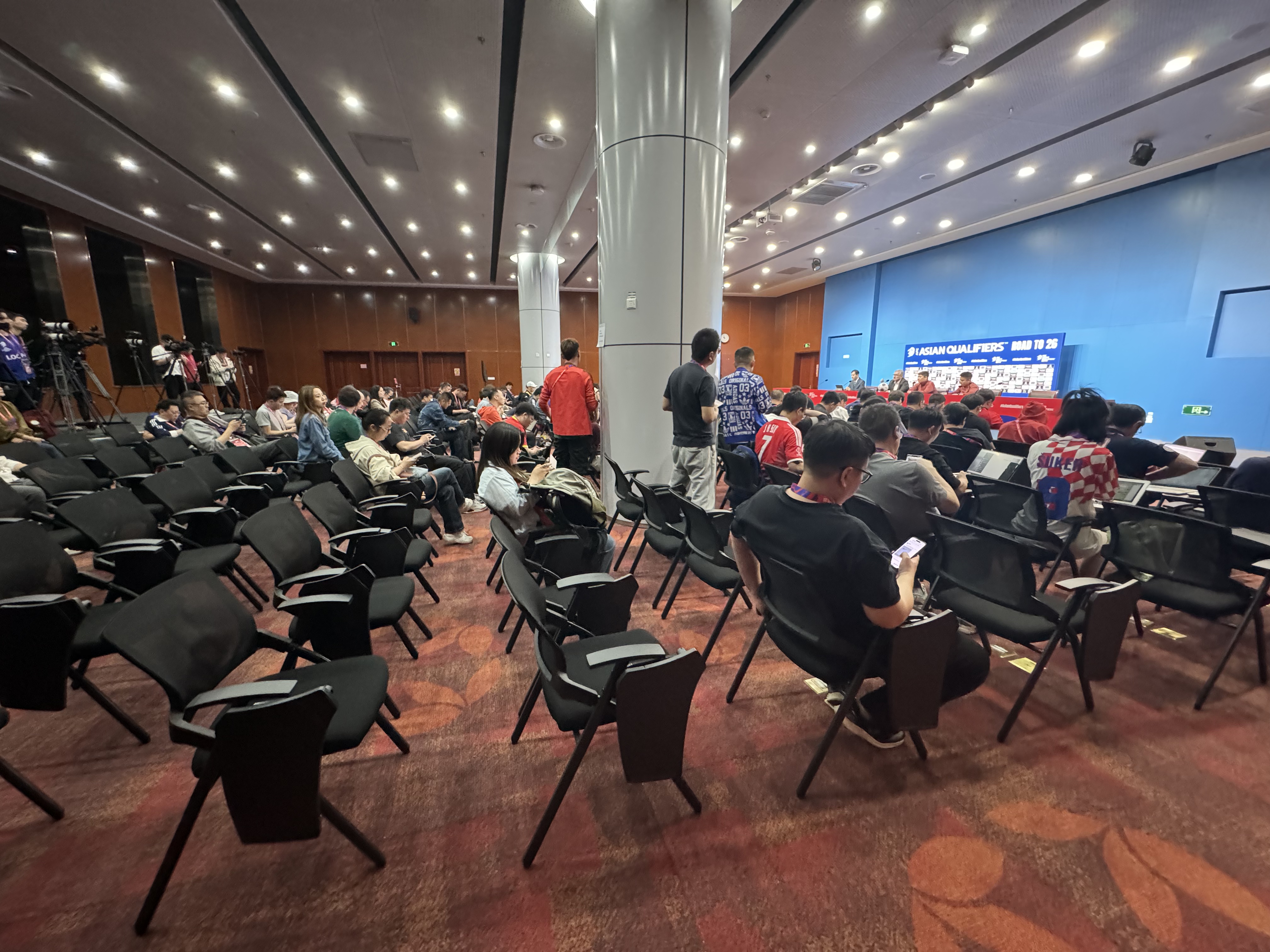 賽前報道本場比賽的文字記者共251人,攝影記者共155人,好像臨時還有增加。但是賽后的發(fā)布會,記者少了很多人。