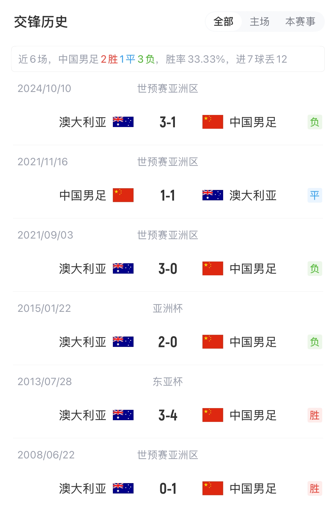 03月25日訊 世預(yù)賽亞洲區(qū)18強(qiáng)賽,國足主場0-2負(fù)于澳大利亞,A級(jí)賽對(duì)這一對(duì)手的連續(xù)不勝場次擴(kuò)大到5場。