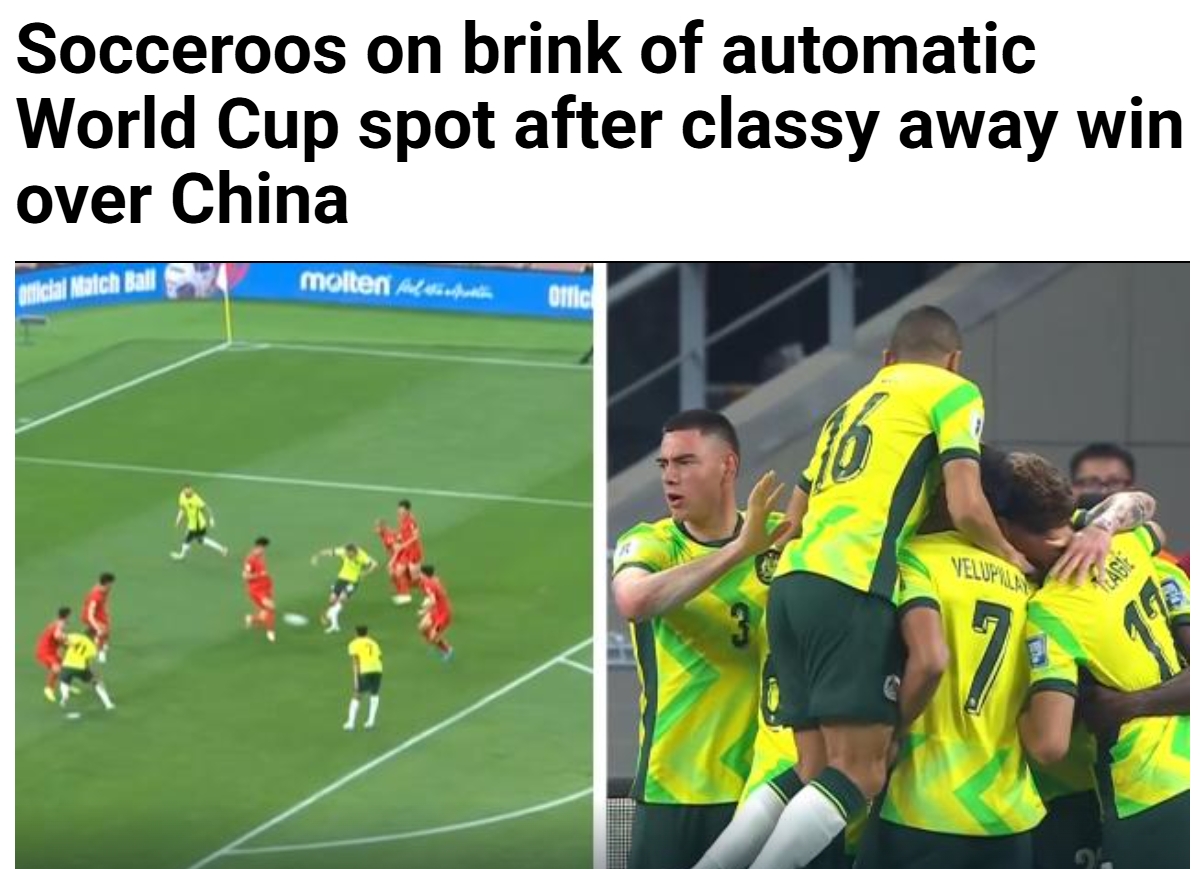 03月25日訊 國足主場0-2不敵澳大利亞。賽后澳大利亞媒體Foxsport發(fā)文,表示澳大利亞只需1場勝利即可直通2026世界杯。