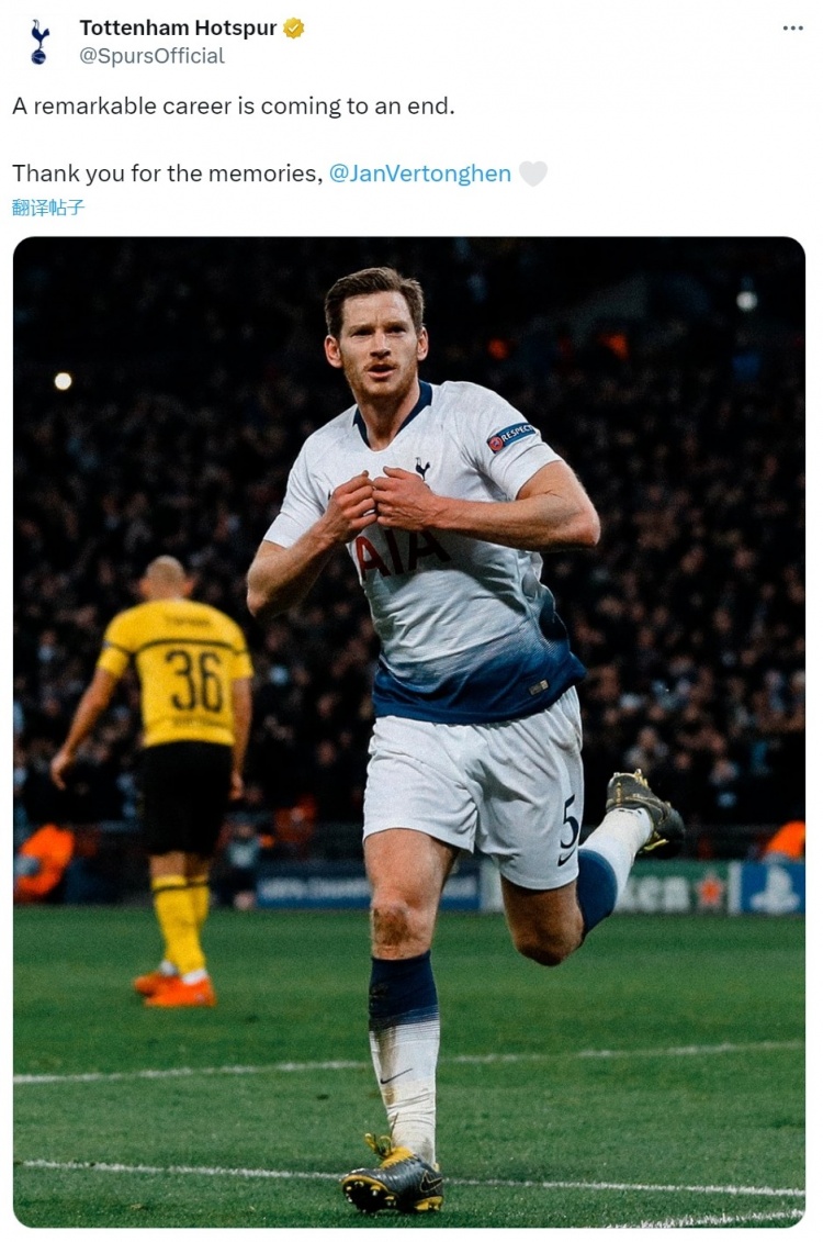 熱刺官方社媒曬出維爾通亨效力球隊(duì)時(shí)期的照片,并配文:“非凡的職業(yè)生涯即將結(jié)束,感謝你留下的回憶,維爾通亨?!?/p>